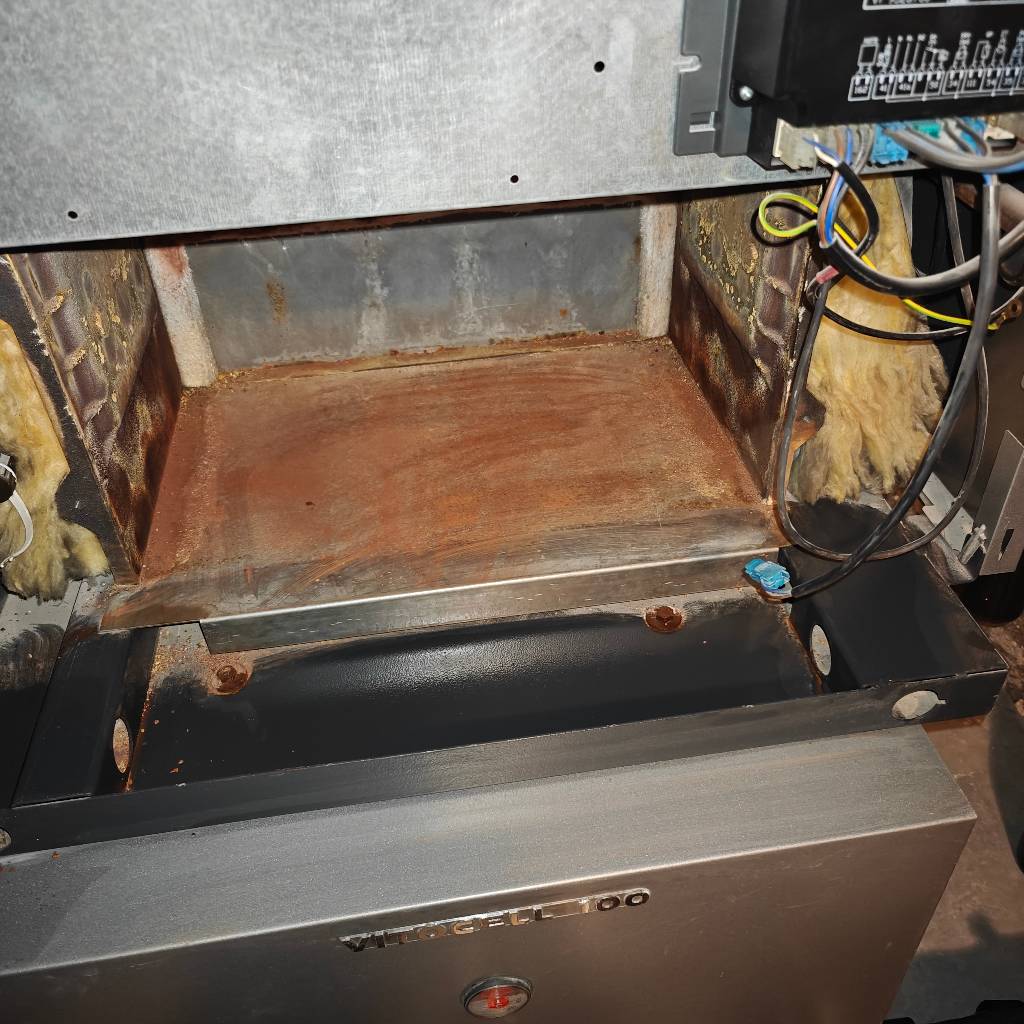 - Mise en sécurité (gaz/élec.), dépose des panneaux, nettoyage foyer/brûleur et surfaces d’échange fonte.